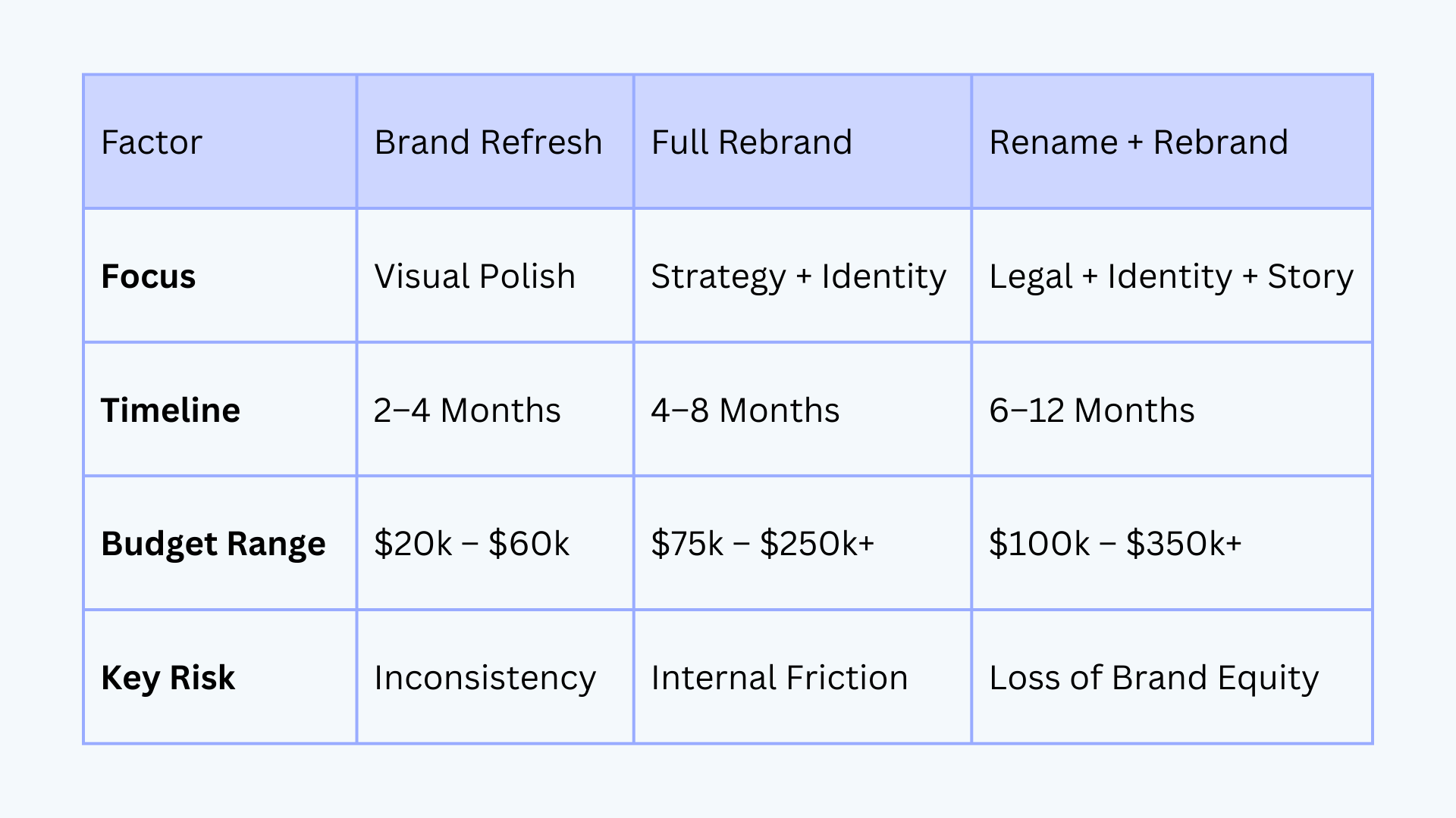 Rebrand vs Refresh vs Rename: The Decision Tree (Timelines + Budget Ranges)